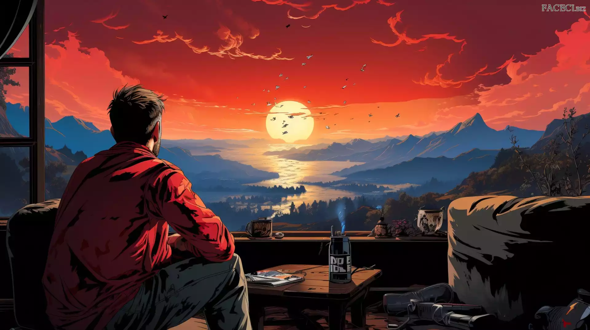 Balkon, Mężczyzna, 2D, Zachód słońca, Góry - faceci.biz